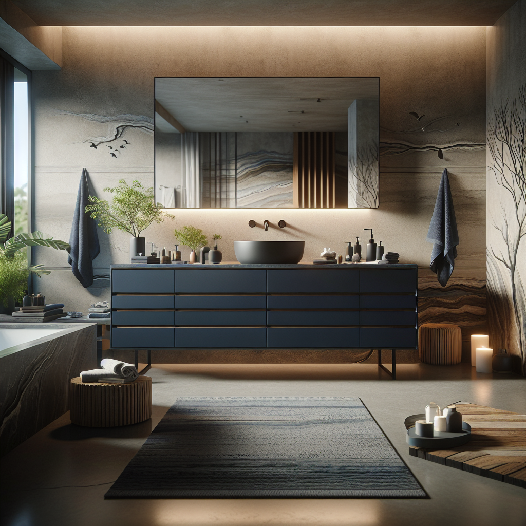 A modern bathroom vanity in navy blue with natural wood accents, integrated sink, and stylish decor.