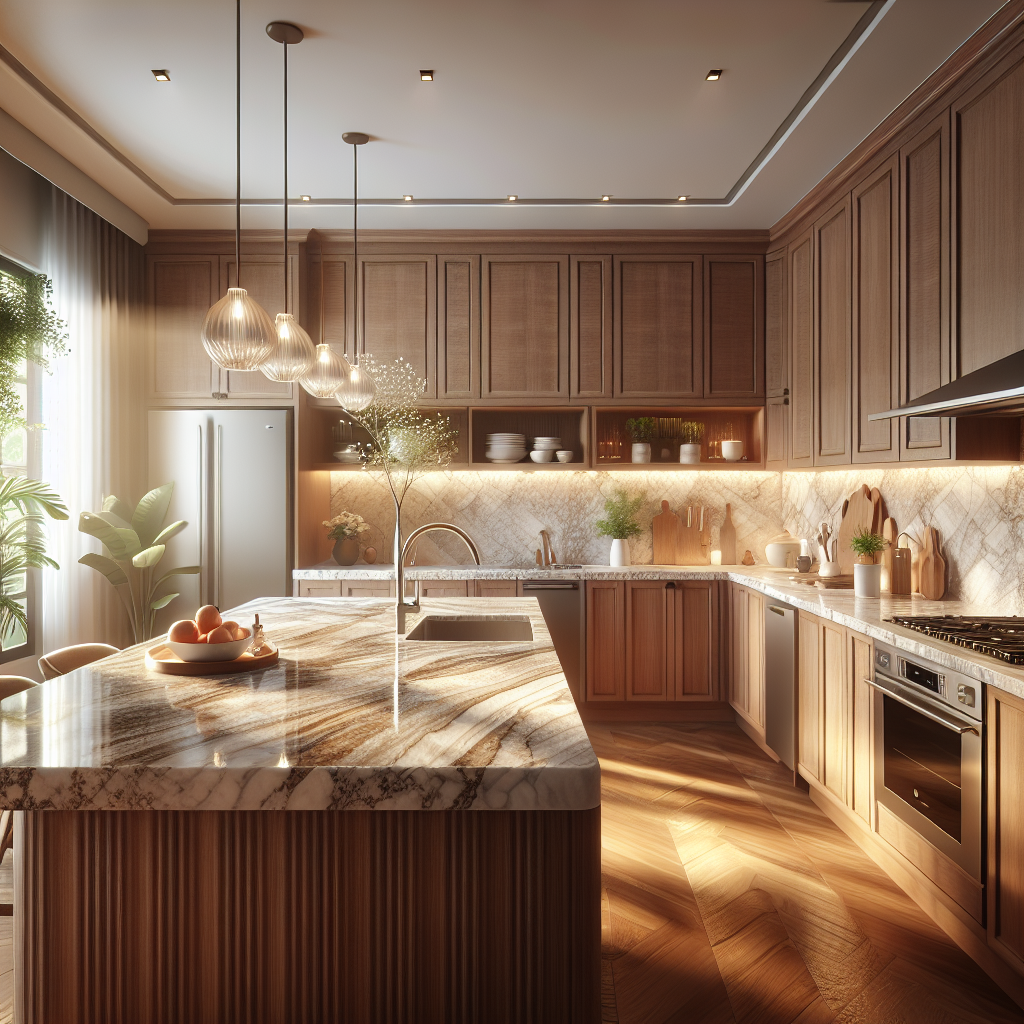 A modern kitchen with beautiful stone countertops made of granite, marble, and quartz, emphasizing elegance and functionality.