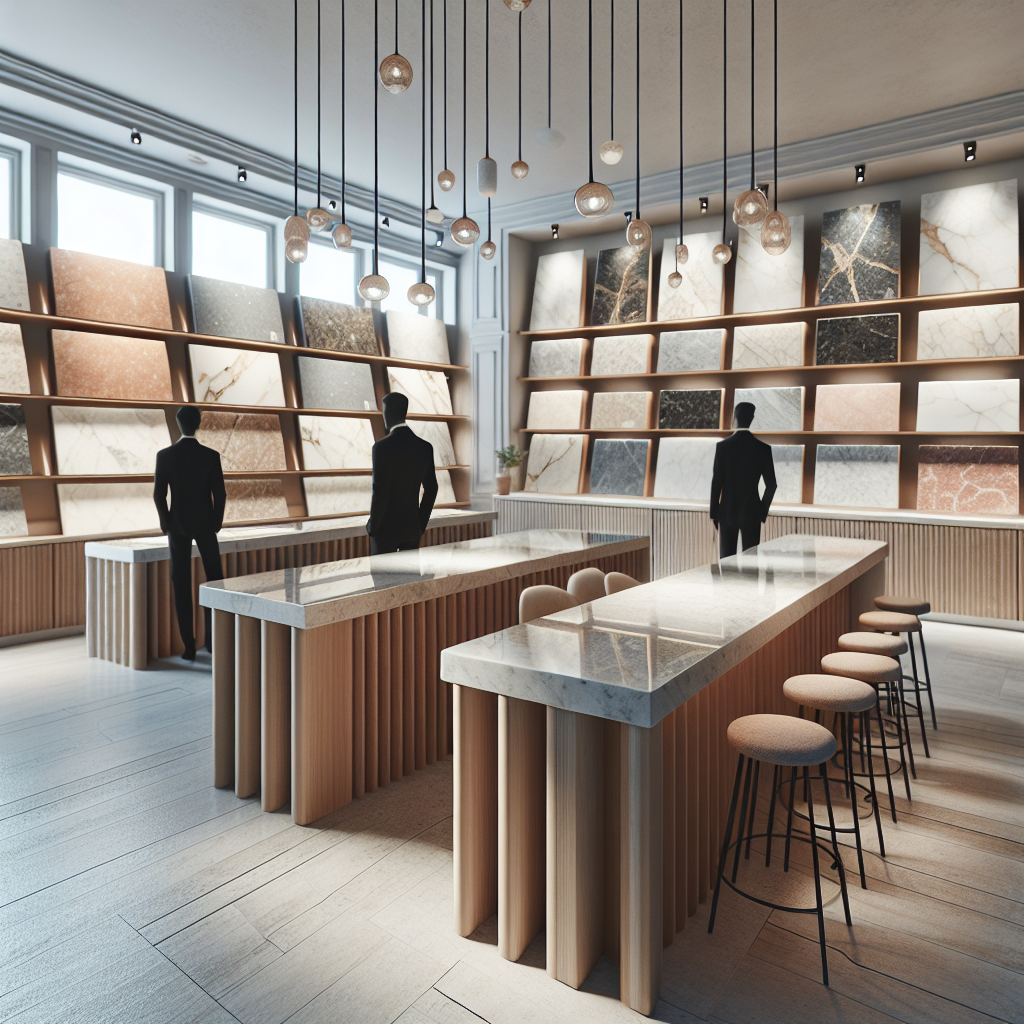 An interior of a quartz countertop shop with a salesperson assisting customers.
