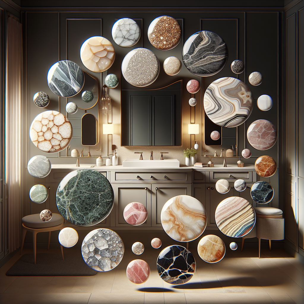 A collage of various bathroom vanity top materials including granite, quartz, marble, porcelain, and onyx.